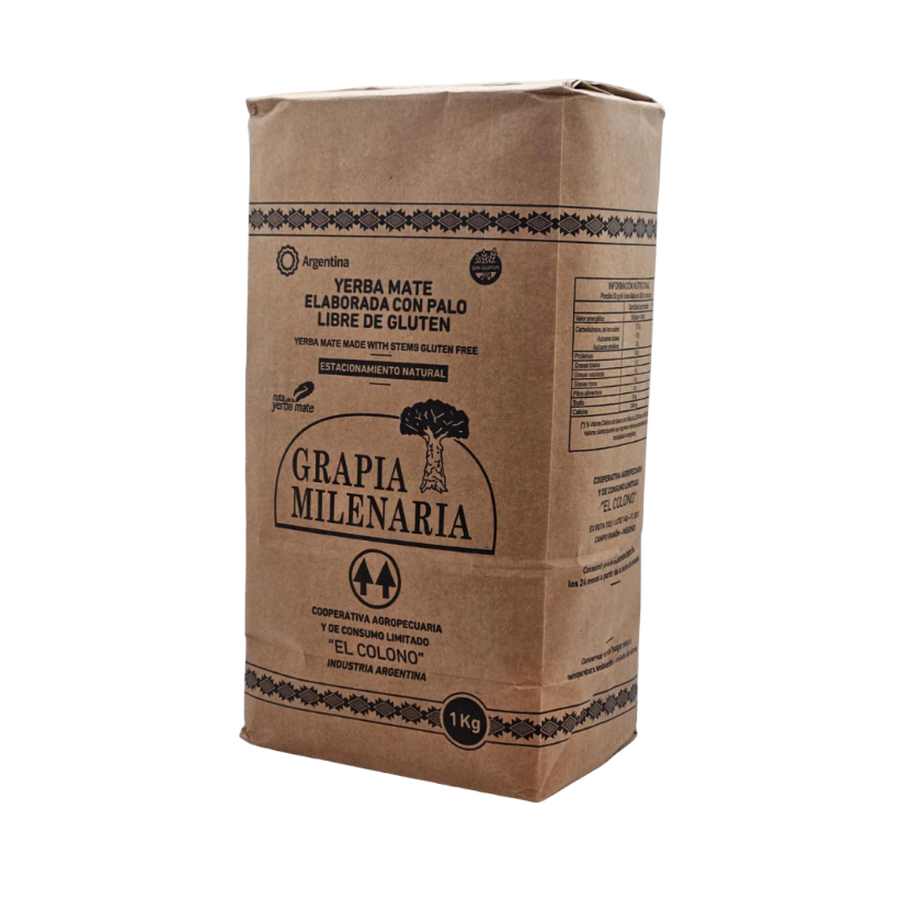 Grapia Milenaria nace en Misiones, cultivada por la cooperativa “El Colono” en Campo Ramón. Tiene 18 meses de estacionamiento natural, secado en cinta y molienda media-fina, lo que produce un mate suave, equilibrado y duradero. Todo sin químicos, con bajo contenido de polvo y luchando por preservar el entorno natura.